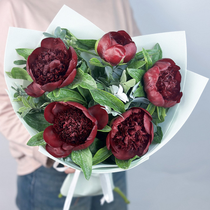Яркий букет из 5 бордовых пионов с зеленью в стильной упаковке