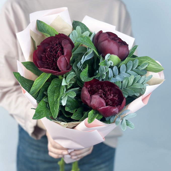 Яркий букет из бордовых пионов и зелени в стильной упаковке