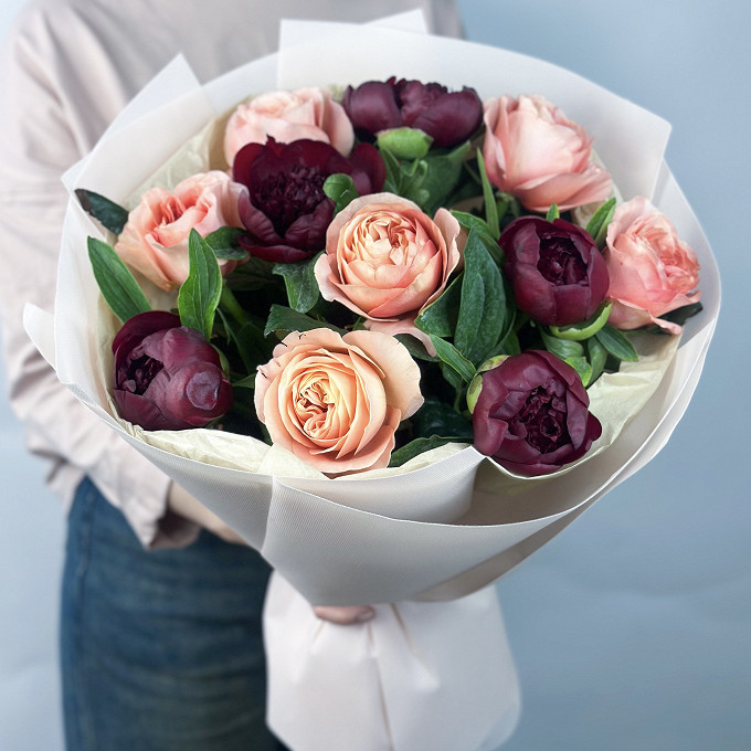 Яркий букет из бордовых пионов и персиковых пионовидных роз в упаковке суфле