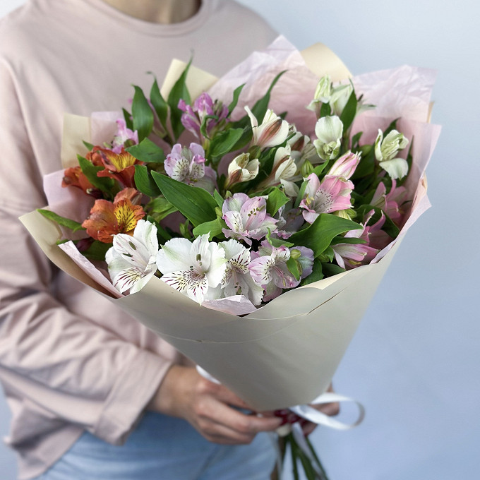 Яркий букет из синих французских роз и белой альстромерии в упаковке