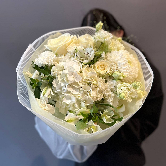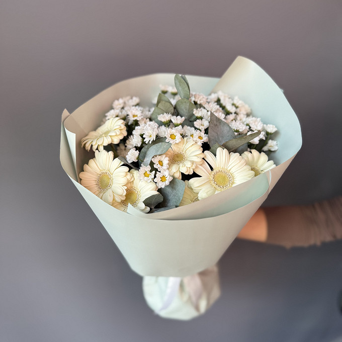 Букет из гермини и хризантем сантини "Белая сказка"