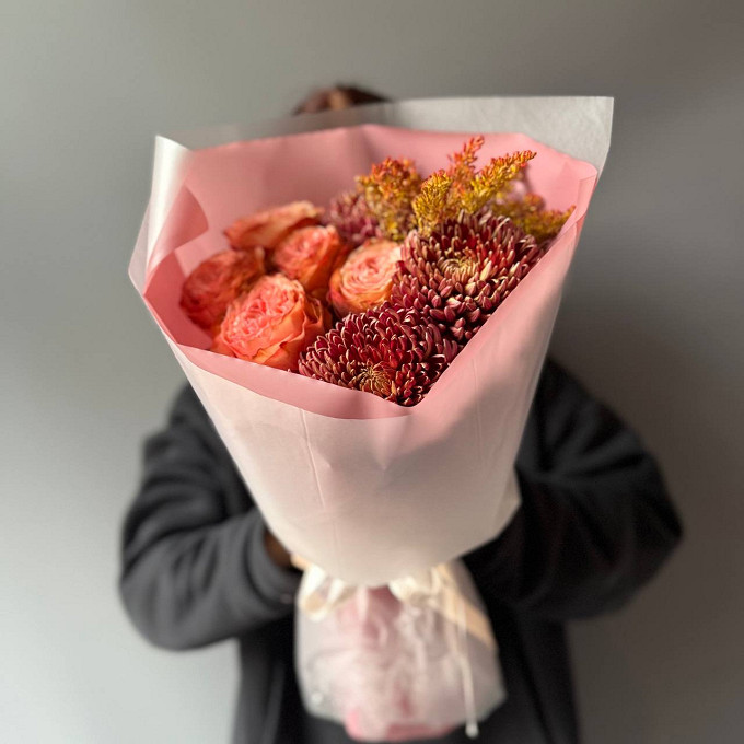 Букет из пионовидных роз и хризантем Бигуди "Осень красная"