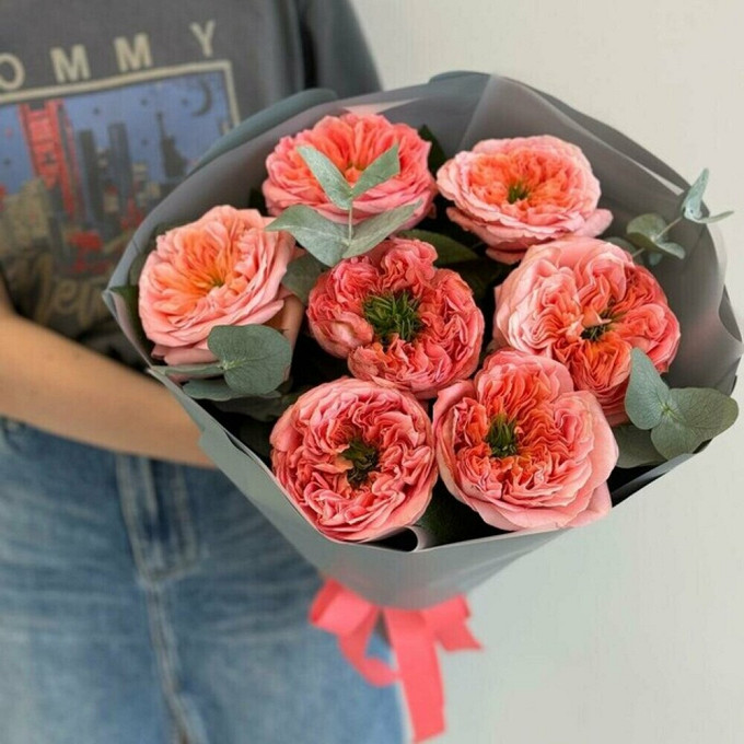 7 пионовидных роз " Мандарин экспрешен" с эвкалиптом