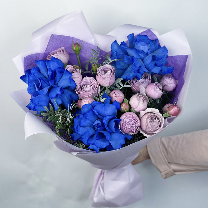 Яркий букет из синих французских роз и сиреневых пион роз в матовой упаковке в Санкт-Петербурге